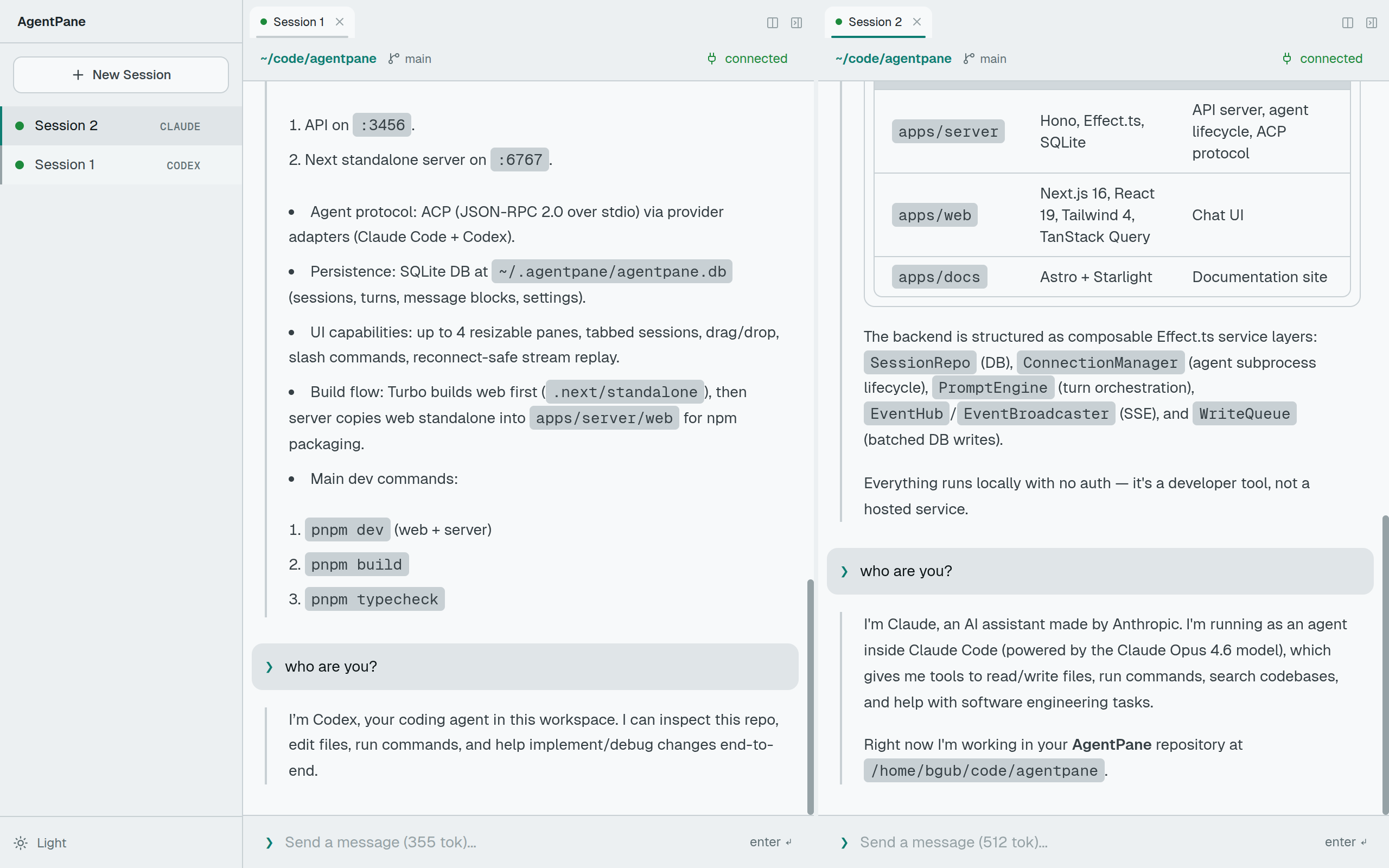 agentpane is a local web UI for AI coding agents. You run npx agentpane, it opens in your browser, and you can talk to Claude Code, Codex, or any agent that speaks ACP (Agent Client Protocol) — all from a multi-pane interface with streaming, persistence, and session management: